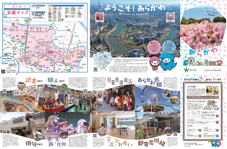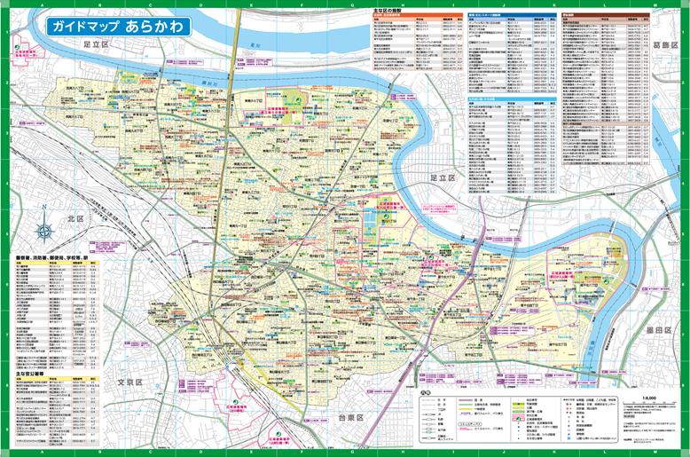 「ガイドマップあらかわ」は、公共施設、おもな官公署等の位置を荒川区8000分の1の地図に記したものです。また、区の歴史やあらまし、交通ルートなども紹介しています。