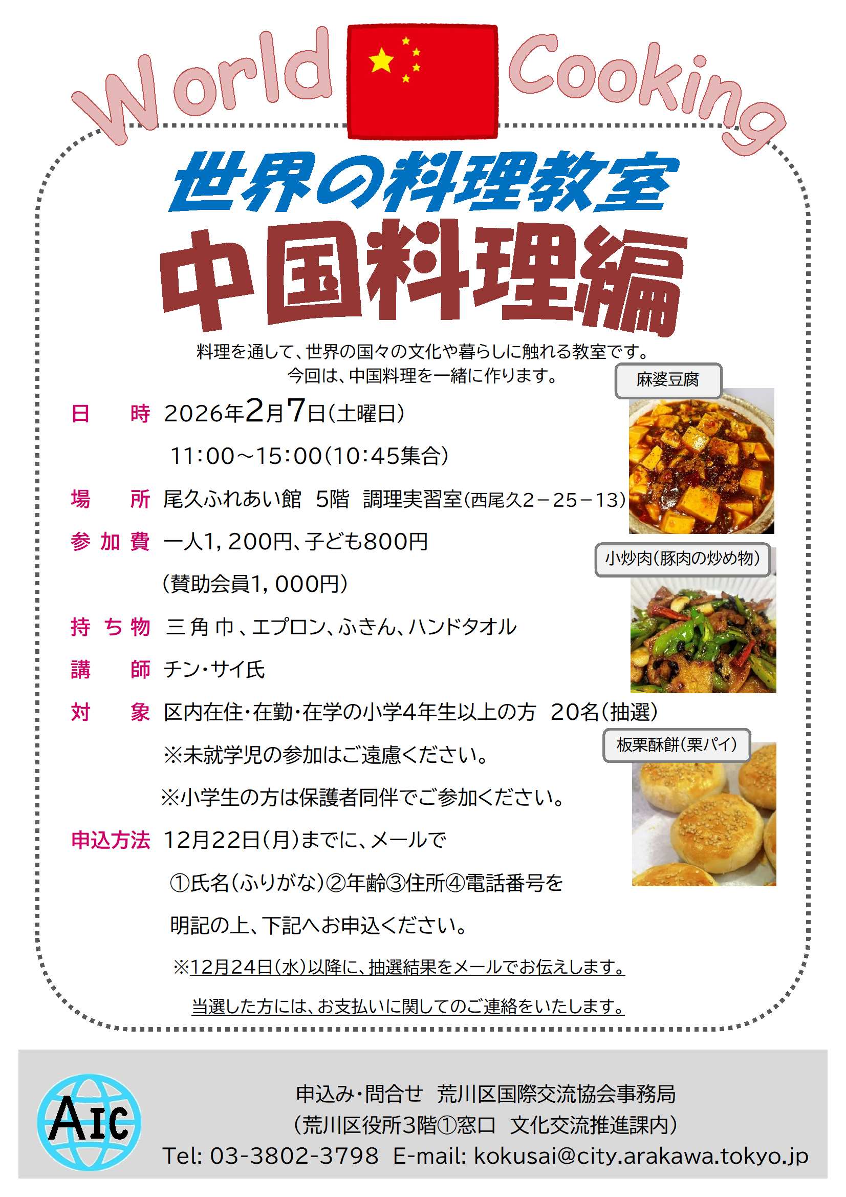 中国料理の料理教室となります。荒川区国際交流協会が主催している日本語教室受講生の方が先生となって、参加者の皆さんと一緒に料理を作っていきます。詳しくは、下のチラシをご覧ください。