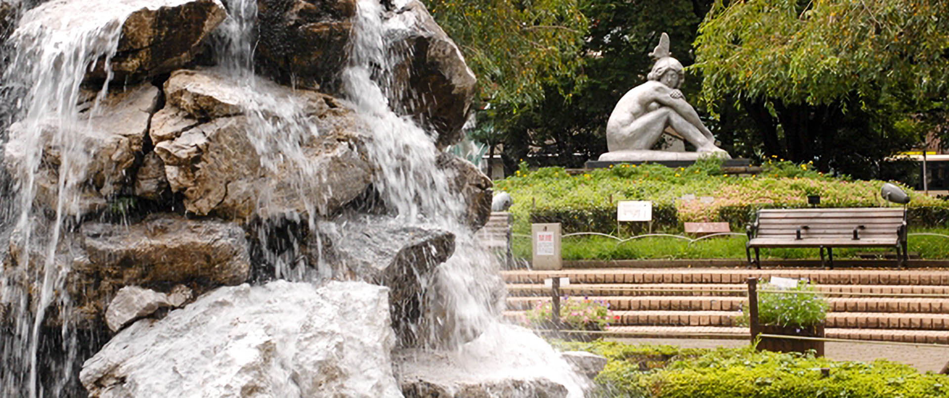 公園の中央には、長崎の平和祈念像の作者の北村西望氏の彫像「夢」があります。春には、ソメイヨシノなどの桜が咲き乱れ、花見会場として開放されています。この公園隣の「実のなる木公園」には、四季折々の実のなる木が植樹されています。