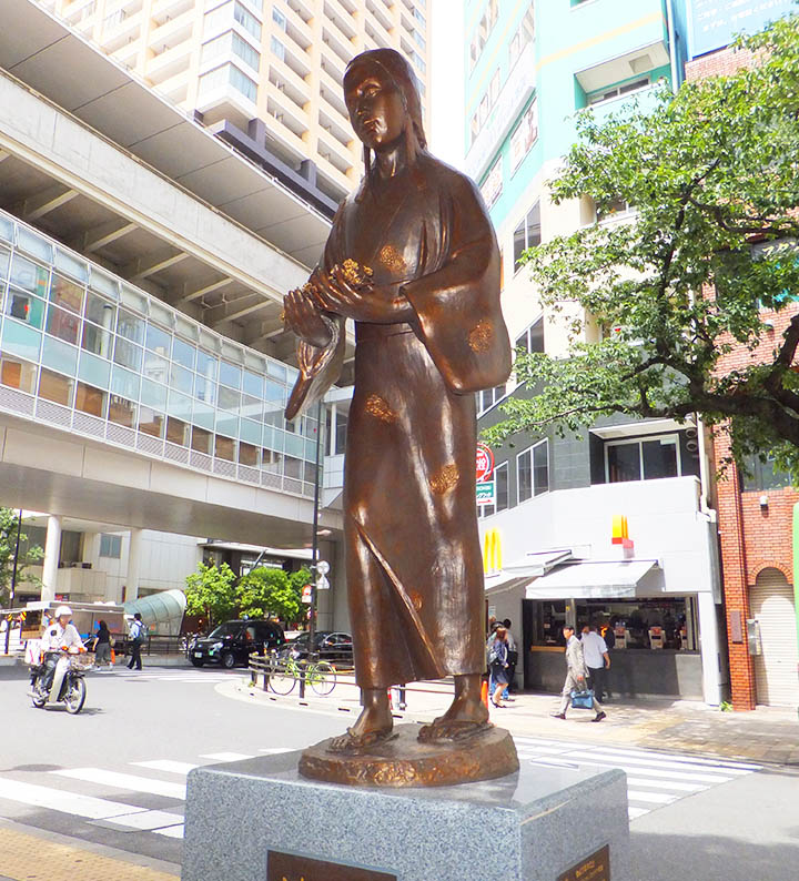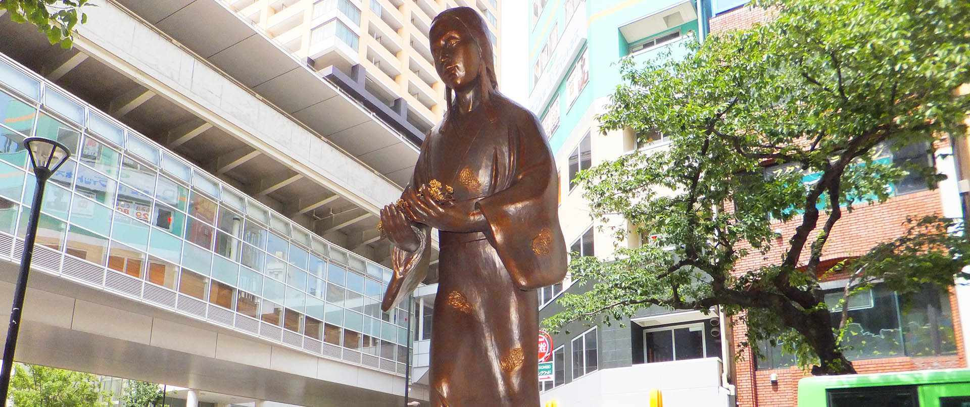 日暮里の地ゆかりの武将・太田道灌の「山吹の里伝説」にちなんで制作されました。道灌が鷹狩り中に急な雨に遭いみのを借りるために立ち寄った農家の娘が「七重八重花は咲けども山吹のみ(実)の一つだになきぞ悲しき(兼明親王)」の和歌に掛けて、みのがないことを「山吹の一枝」を渡して伝えたと言われています。