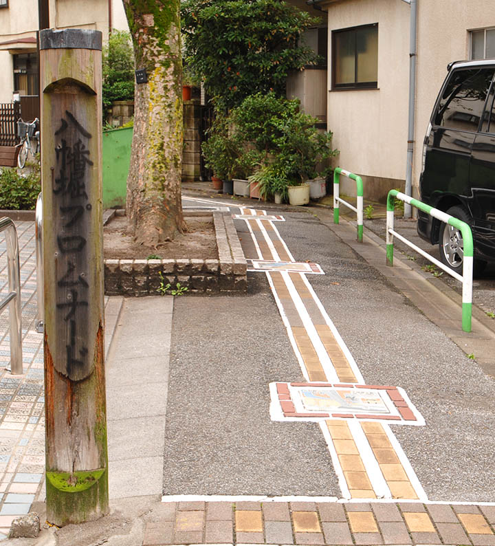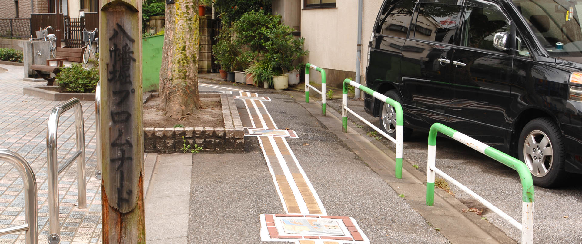 昭和63年(1988)頃、区立尾久宮前小学校の授業で、八幡神社を中心に音無川から農業用水を引いていたことを示す地図を見た児童たちは、今は流れていない何本もの川の存在を知り、お年寄りたちから昔の様子を聞き、この取り組みを次代に伝える為、この路ができました。
