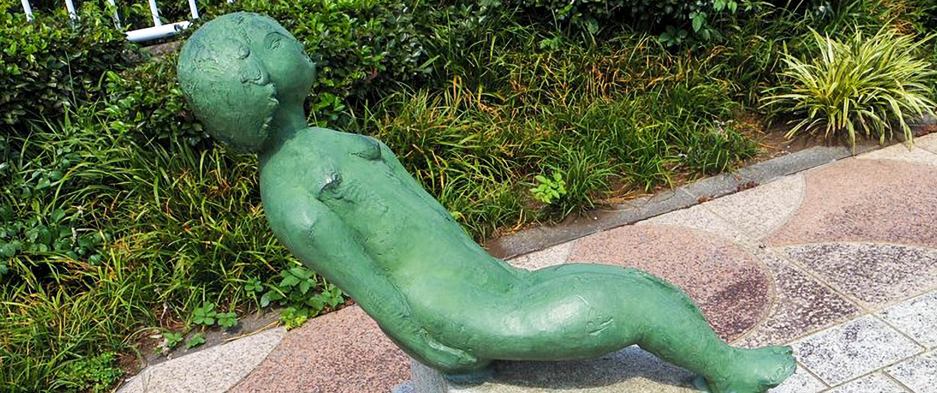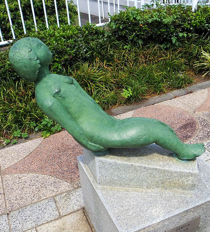 当地には掛井五郎氏の「空を見る少女」があります。半ば横たわるような姿で空を見上げる少女は、何を想っているのでしょうか。その表情は、モディリアーニの描く女性像にも似た、とらえどころのないまなざしを揺らめかせて魅力的です。