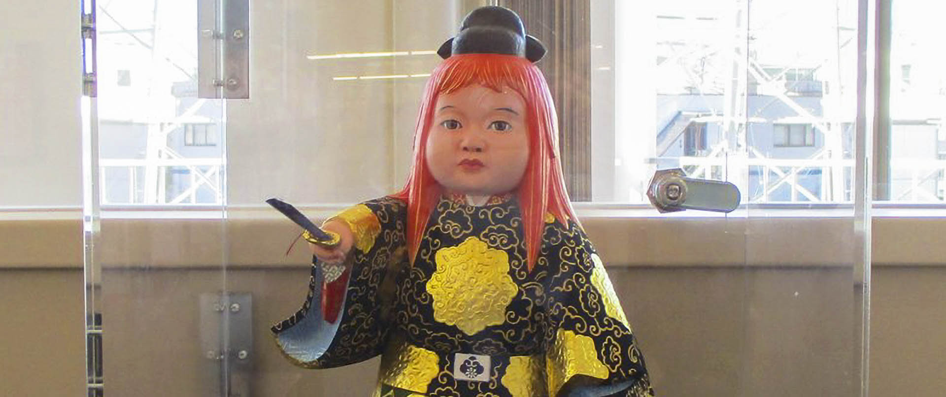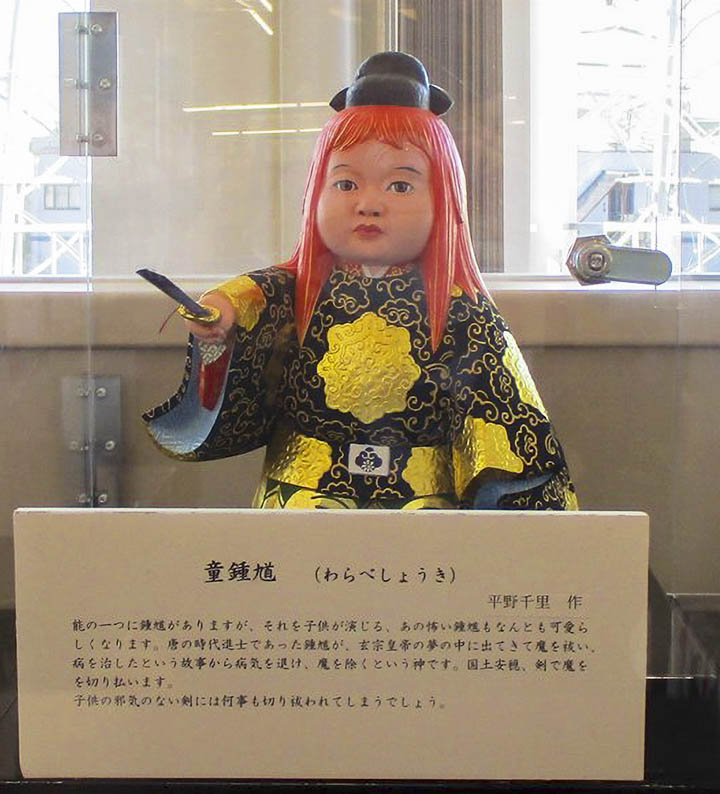 当地には平野千里氏の「童鍾馗」があります。能のひとつに鐘馗がありますが、それを子どもが演じる、あの怖い鐘馗もなんとも可愛らしくなります。唐の時代、進士であった鐘馗が玄宗皇帝の夢の中に出てきて魔を祓い、病を治したという故事から、病気を退け魔を除くという神です。国土安穏、剣で魔を切り祓います。子どもの邪気のない剣には何事も切り祓われてしまいます。他に1体の作品があります。