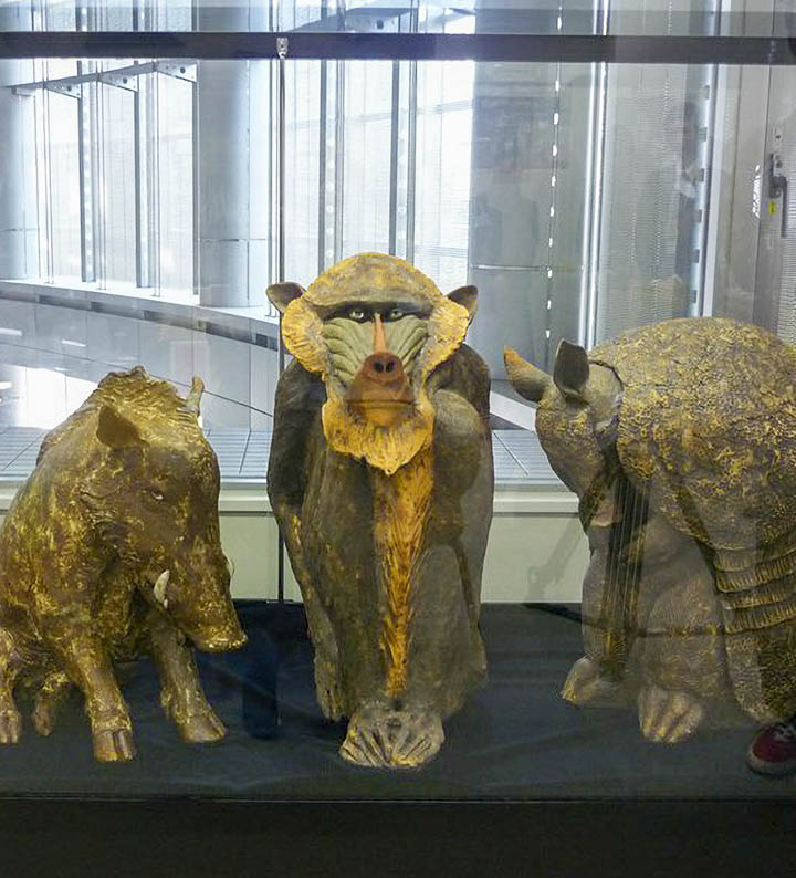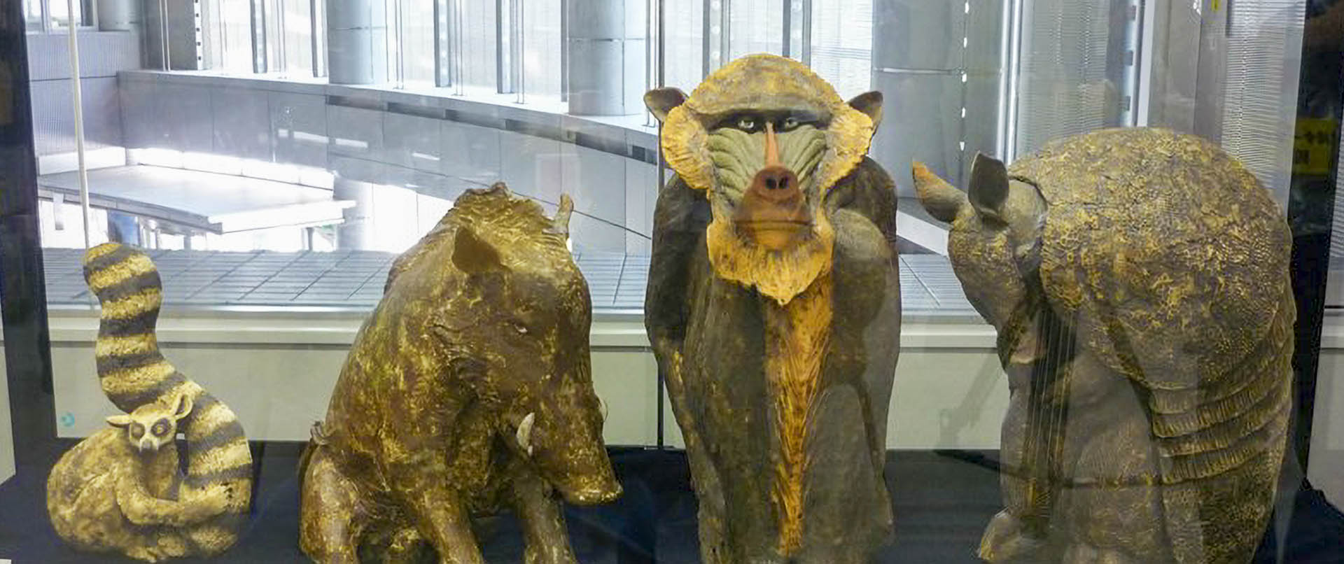 南千住図書館には北郷江氏の「話し」があります。作品説明4点で一組となる。絵本の1シーンをイメージさせるように、動物たちが会話をしている。話がとぎれず、つきないくらい話をしている物語的なシーンを想定して制作した。すべて陶土で出来ており、本焼である。