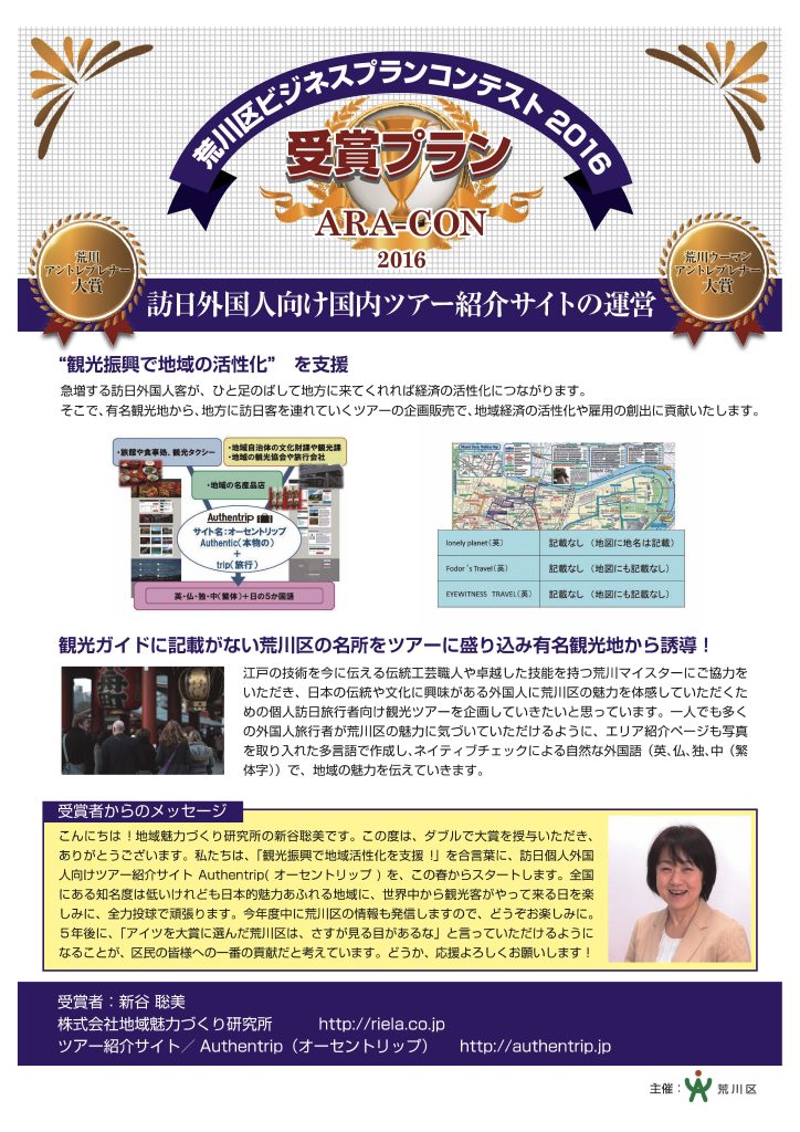 新谷聡美 | 訪日外国人向け国内ツアー紹介サイトの運営 | 荒川アントレプレナー大賞 荒川ウーマンアントレプレナー大賞 (両賞受賞) |