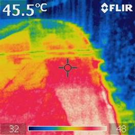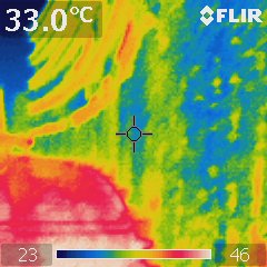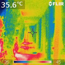 下記の写真は本庁舎2階の緑のカーテンをサーモカメラで測ったものです。
