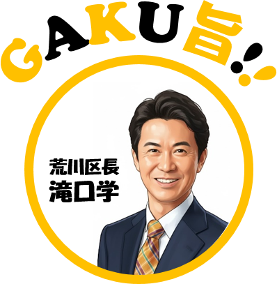 滝口学(がく)区長がおすすめする「あらかわ健康ごはん」は下の「GAKU旨」マークが目印です。
