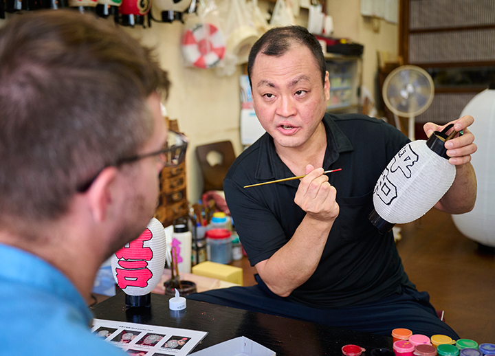 泪橋大嶋屋で提灯作りをする前に、店の壁一面に飾られた伝統的で美しい江戸提灯をぜひご覧ください。4代目主人である村田さんのサポートのもと、1912年にさかのぼる由緒ある店の歴史や、皆に親しまれている江戸提灯が地域社会や行事をいかに支えてきたかを学びながら、お持ち帰りできる自分だけのオリジナルデザインの提灯を作りましょう。