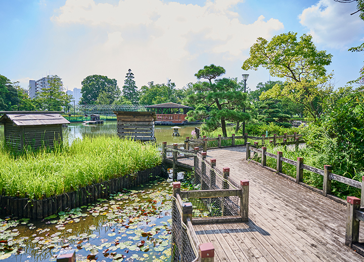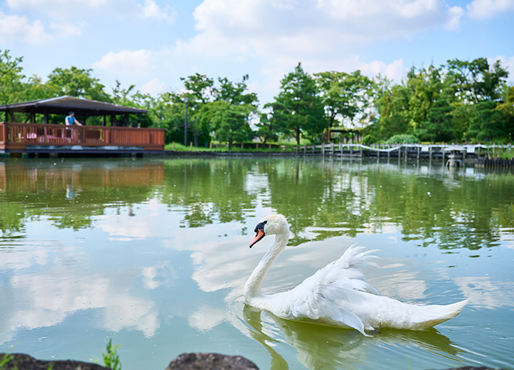 荒川自然公園は、白鳥が泳ぐ池や、季節の花が点在する美しい景色を楽しめる遊歩道などがある、約61,000平方メートルの緑豊かなスポットです。公園を取り囲む都会の景観に鮮やかなコントラストを生み出しています。また、公園の南側には旧三河島汚水処分場喞筒(ポンプ)場があり、この公園が三河島水再生センター(下水処理施設)の上に人工地盤を造って整備された歴史を感じることができます。